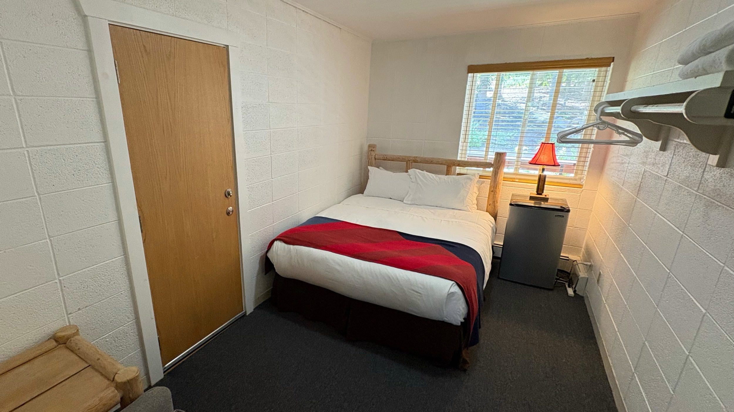 A cozy private room with a queen bed and mini fridge. Community bathrooms are just down the hall, separated for men and women. Adjoining option available.