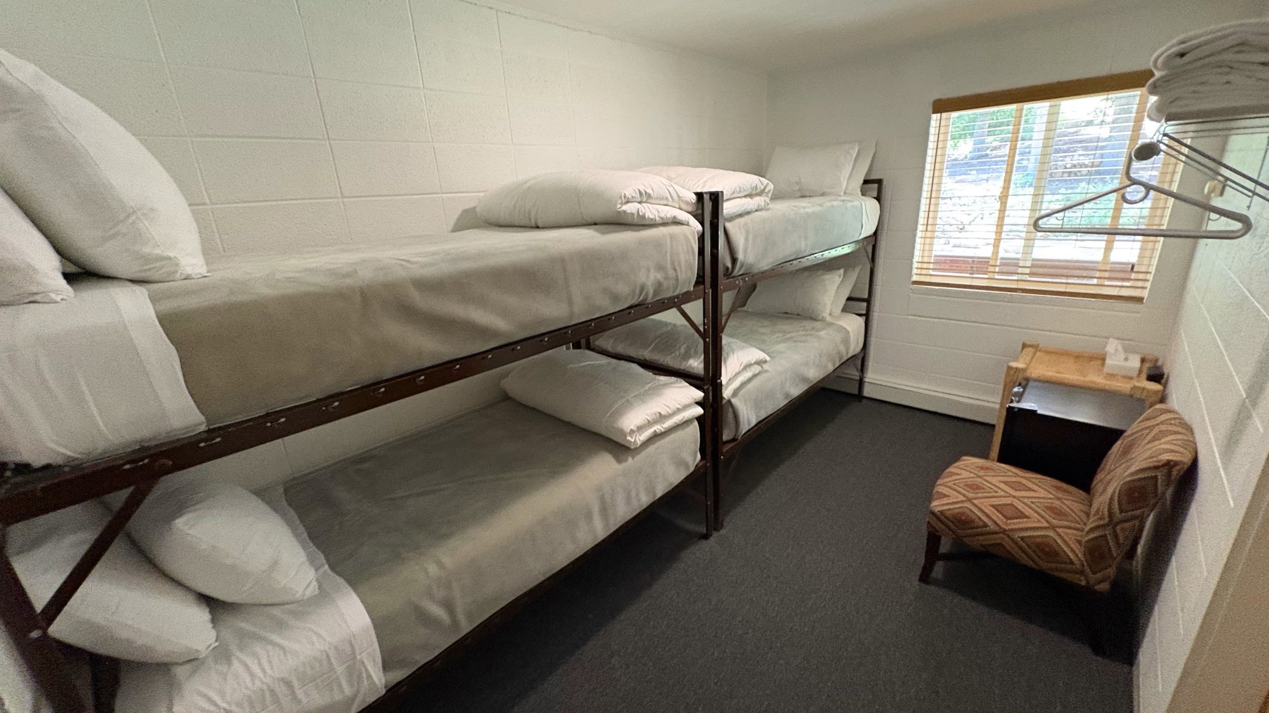 A private room with two twin bunkbeds (4 beds total) and a mini fridge. Community bathrooms are located down the hall with separate men’s and women’s facilities. Adjoining option available.